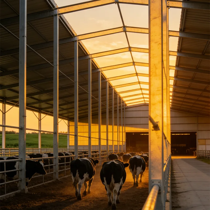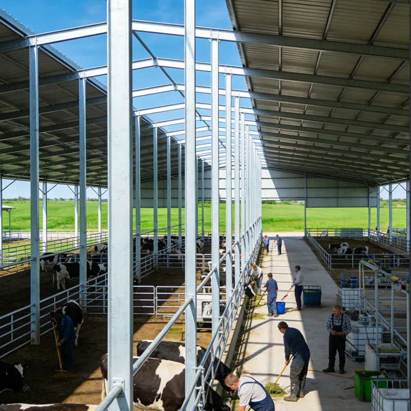 Наш коровник и молочный коровник со стальным каркасом — это профессиональное, долговечное и экономичное здание для разведения скота, специально разработанное для современного животноводства и производства молочных продуктов. Благодаря стабильной стальной конструкции, хорошей вентиляции, отличной теплоизоляции и простоте очистки он обеспечивает безопасную, комфортную и здоровую среду для мясного скота, дойных коров и другого домашнего скота.