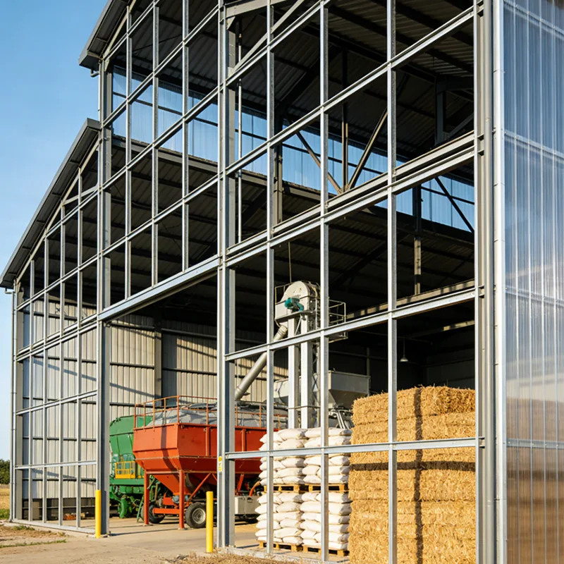 Он разработан с учетом эффективности переработки сельскохозяйственной продукции. Он оснащен большими раздвижными или рулонными дверями (шириной 4–6 м) для облегчения доступа к сельскохозяйственной технике и оборудованию, а также высокой высотой потолка (4–6 м) для размещения вертикальных систем обработки или стеллажей для хранения. Цех оборудован системами естественной вентиляции (потолочные + боковые) и опциональной механической вентиляцией или кондиционером, обеспечивающими комфортные условия труда и предотвращающими накопление влаги. Цех обработки фермы со стальным каркасом также поддерживает интеграцию с электрическими системами, освещением и водопроводом, предоставляя готовое решение для ваших потребностей в переработке. Открытая планировка помещения позволяет гибко настраивать планировку, адаптируясь к различным рабочим процессам обработки по мере развития вашего бизнеса.
